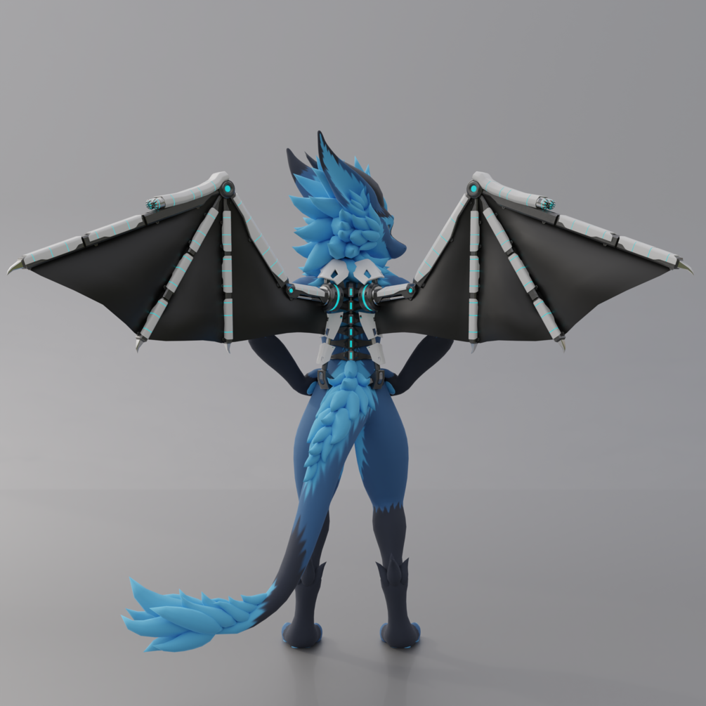 A pair of Cybernetic wings with pistons that move as if to support the spine, and a two axis puppet control to pose the wings for pictures in VRChat.